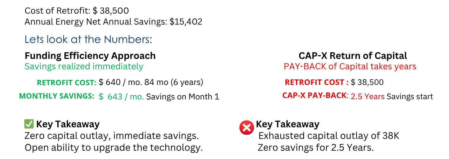 Energy-efficient technologies not only provide savings but also contribute to proper revenue first structuring. Net Savings Funding Instrument should be used to fund capital restoration without compromising cash reserves and the use of CapX is financially damaging to leveraging the utility of ongoing technology improvements. Consistently reduce costs, capture savings based in ongoing applications of efficiency and automations. —without relying on Cap-X loans, or escalated service/maintenance fees.